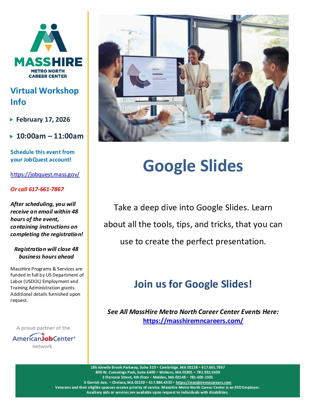 Google Slides is an efficient tool for creating presentations. In this workshop, become familiar with Slides starting from the very beginning. Learn to create a presentation, edit, and share. Leave feeling like you can successfully create and use a Google Slides presentation.